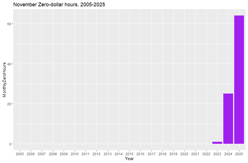 And as highlighted in the beginning, we set yet another monthly record for zero-dollar hours, which are also a great proxy for temporary Excess Supply and generation curtailment. At 64, their number was 156% higher than last year, which itself had set a record for the month of November. Previously, there had been at most one such hour during this time of the year in at least 2 decades. The market is shifting, in a big way: