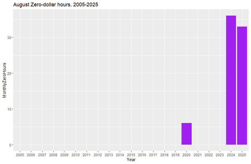 This means that customers with the flexibility to use power when prices are low reaped significant savings, benefiting from wholesale rates that dipped to just 1 cent per kWh. While low prices were common, this record was not set by zero-dollar hours. In fact, there were 33 zero-dollar hours in August—the second-highest number for that month since 2005, just shy of last year's record of 36: