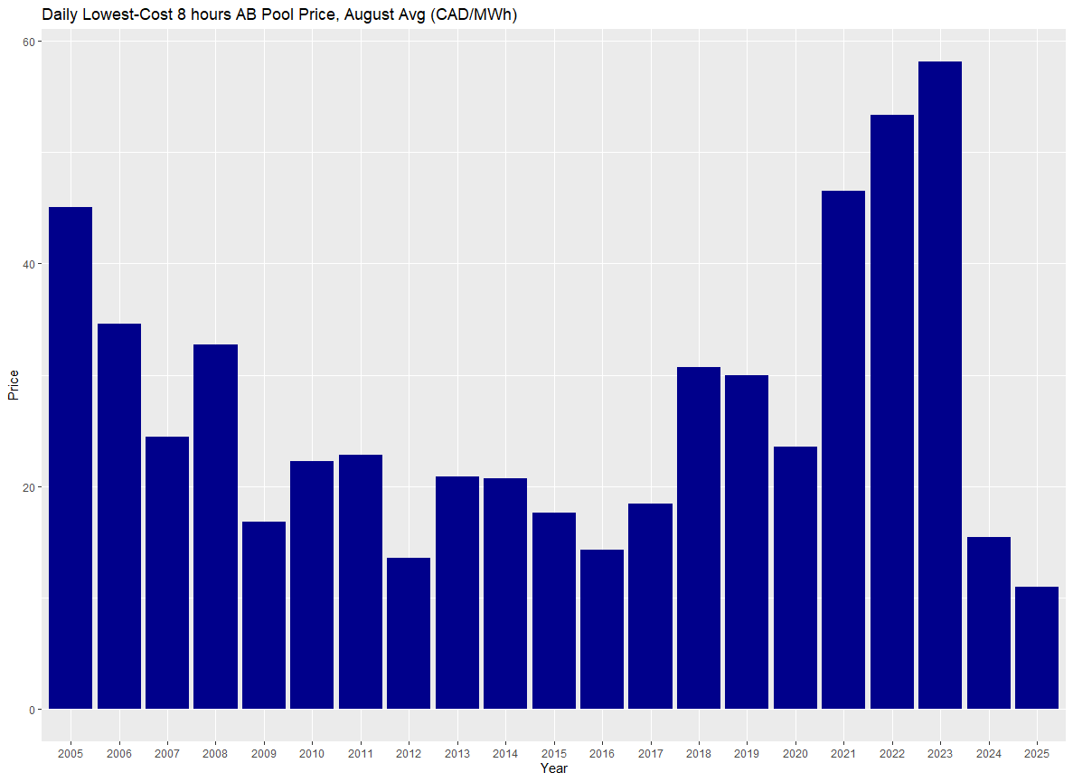 Daily lowest-cost 8 hours, average for August, 2005-2025 (CAD/MWh)
